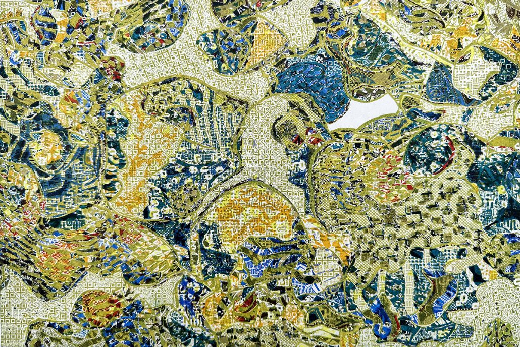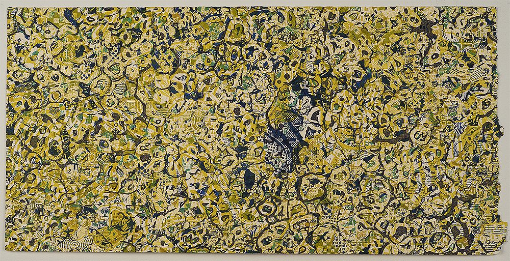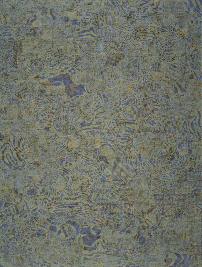 My color prints use layered imagery, diverse color systems and transparency to achieve their rich, complex surfaces, from which calligraphic lines, written forms, organic and geometric shapes, maps and hidden messages slowly emerge. In order to employ color in selected areas, my woodcuts use meticulously cut printing stencils. I use the conceptual methods of making a silkscreen when developing my woodcut images. Like silkscreen, a method I pursued for many years, my image is comprised of multiple layers in both its making and printing. This approach has offered me many options that are outside of the traditional norms in making woodcuts.