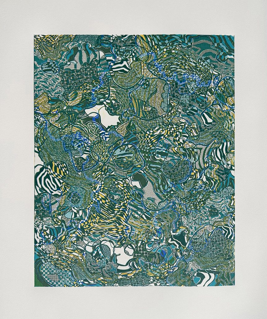 My prints are deeply influenced by my travels to Japan and Asian print culture, most notably through their design and Japanese based color palettes. This method of working has introduced spontaneity into my printing process and its results, as my images, made from multiple interchangeable blocks and the color relationships made through combining transparent hues are actualized once the image is printed. This becomes especially apparent in my Embedded Fragments and Entangled Encryptions series.